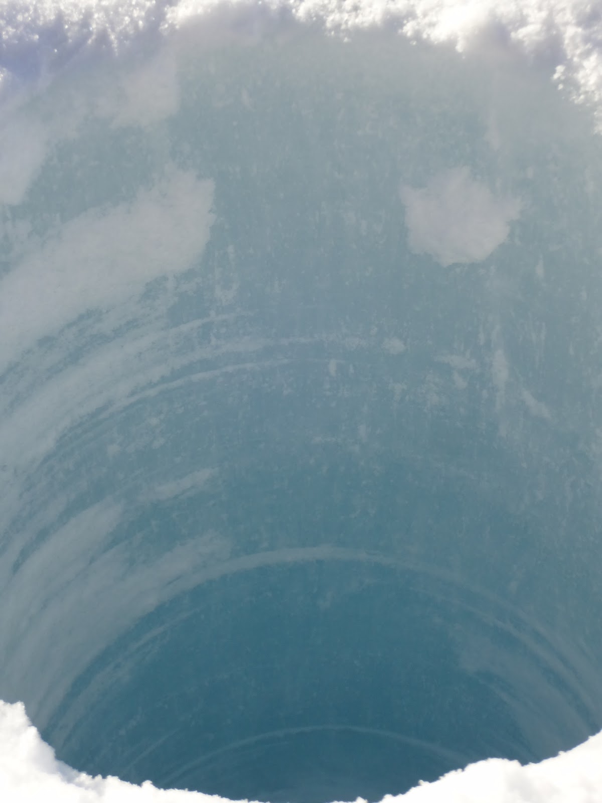 We had no luck here - apparently there is a nearby seal that also uses this hole to come up for air. Also, seals eat fish... The divers let us know that the few that are still below - smartly, seem to be hiding.